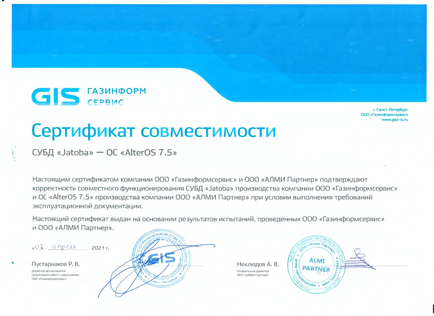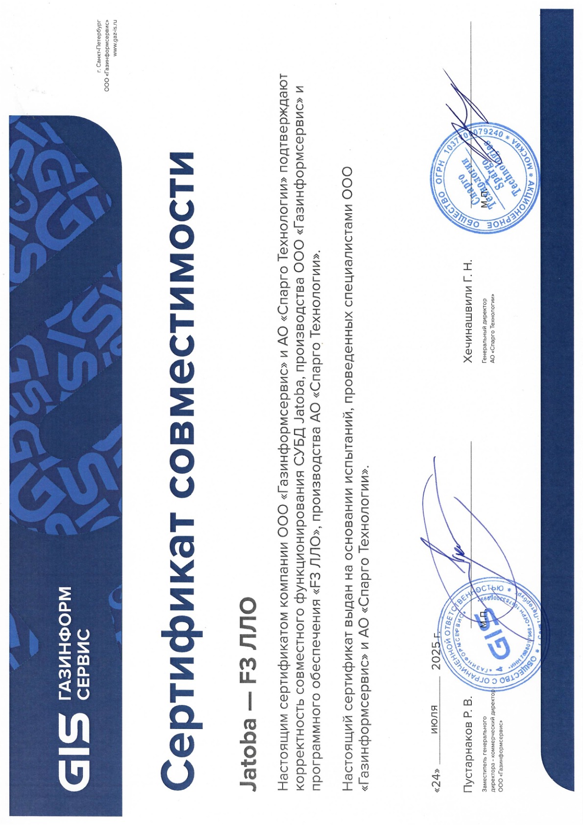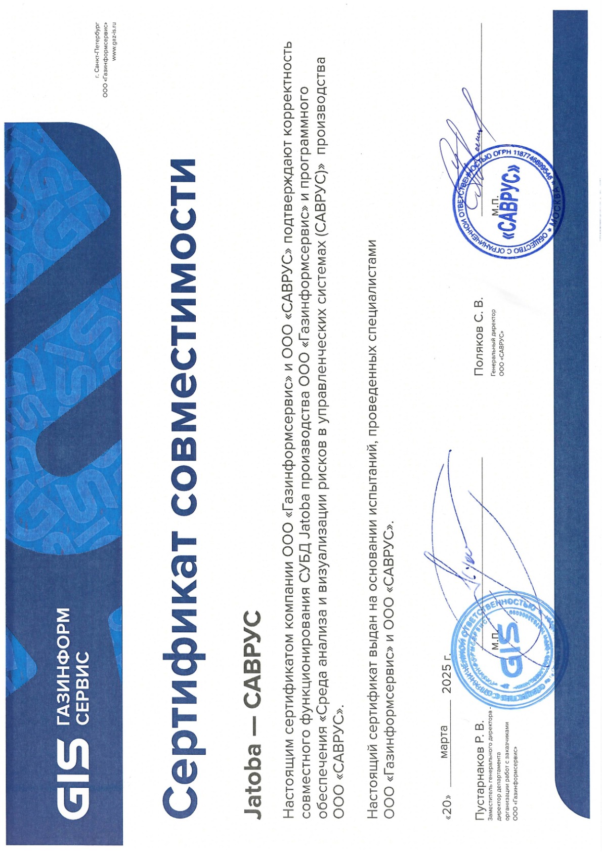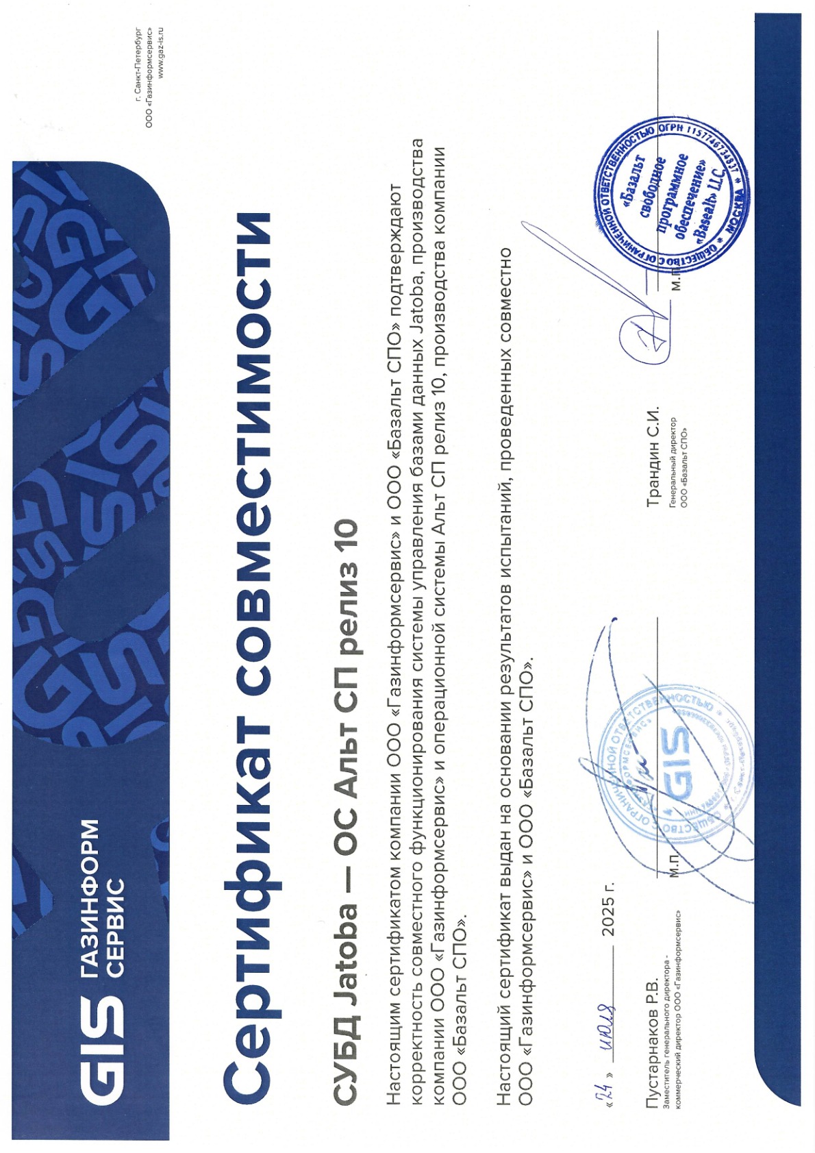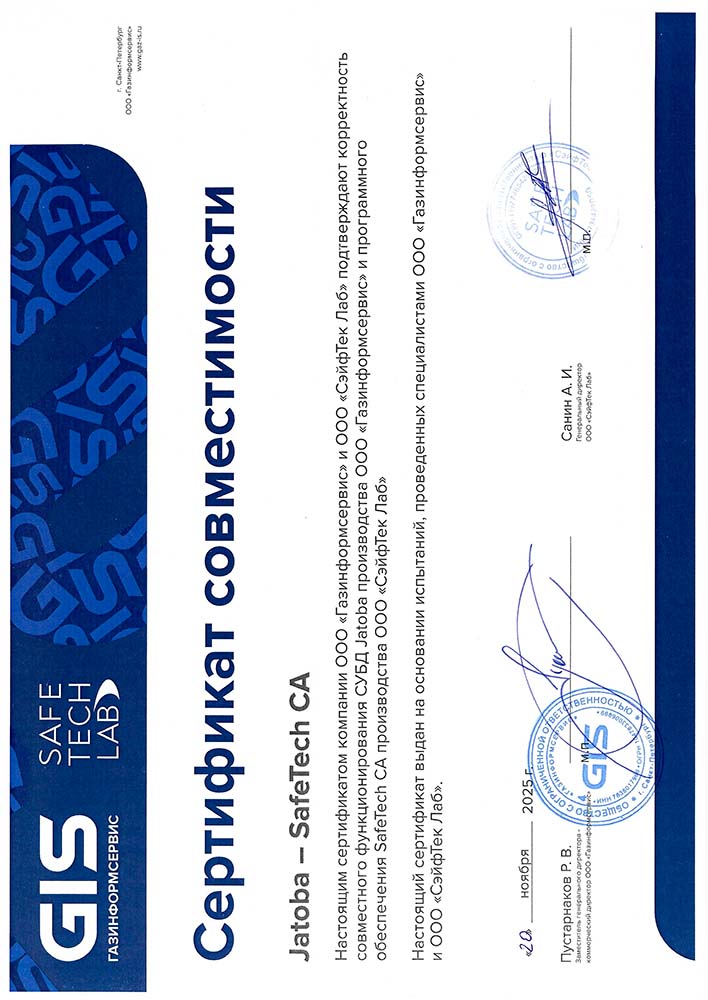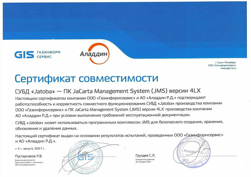 СУБД Jatoba зарегистрирована в реестре российских программ для электронно-вычислительных машин и баз данных и получила сертификат ФСТЭК России в 2020 году